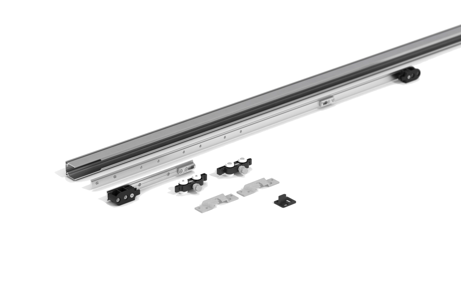 You are buying a system that gives you complete freedom in the design of the door. You choose between frameless glass or wood, and customize width and height.